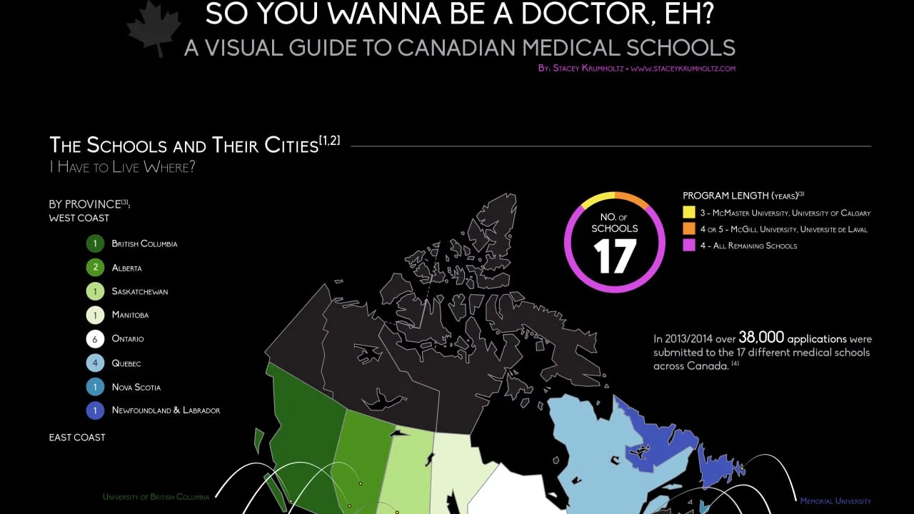 Once upon a time I thought about applying to medical school and one of the things I remember is having 18 tabs open on my computer and an excel spreadsheet, trying to figure out the what's what for each school. As a data visualization project I decided to make an infographic on Canadian Medical Schools. I found it fascinating, in that it revealed some interesting trends on women in medicine (things aren't quite as equal as we'd like to think) and your odds of getting in (don't be from Ontario). Since the infographic is quite long, I made a scrolling video in hopes it makes it easier to view, pause and scrub through at your leisure.