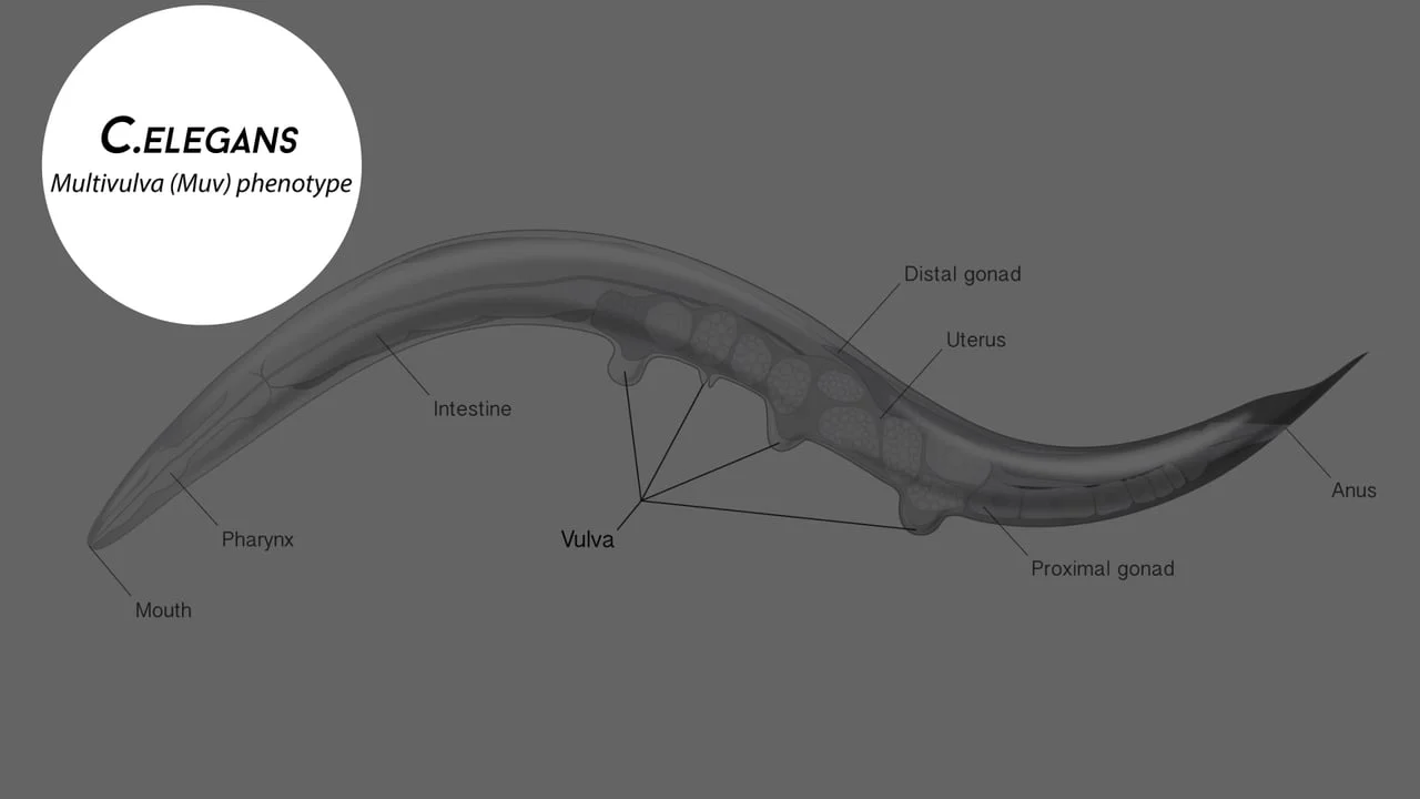 Shining a spotlight on the anatomy of C. elegans Multivulva aka "Muv" phenotype. This specific phenotype is often used in genetic and cell biology research.